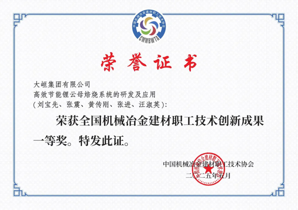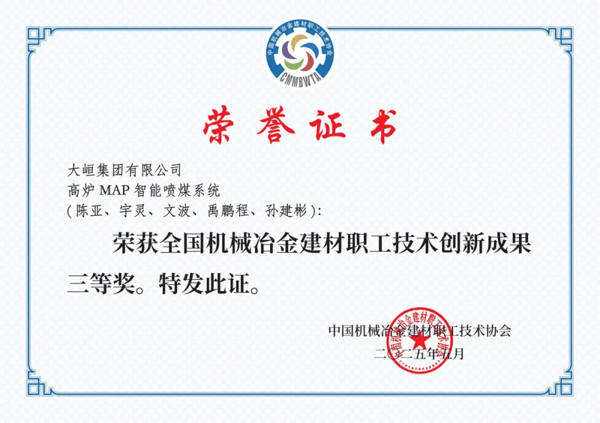 喜報!大峘集團“高效節(jié)能鋰精礦焙燒系統(tǒng)的研發(fā)及應用”榮獲2025年度全國機械冶金建材行業(yè)職工創(chuàng)新成果一等獎;“高爐MAP智能噴煤系統(tǒng)”榮獲三等獎。